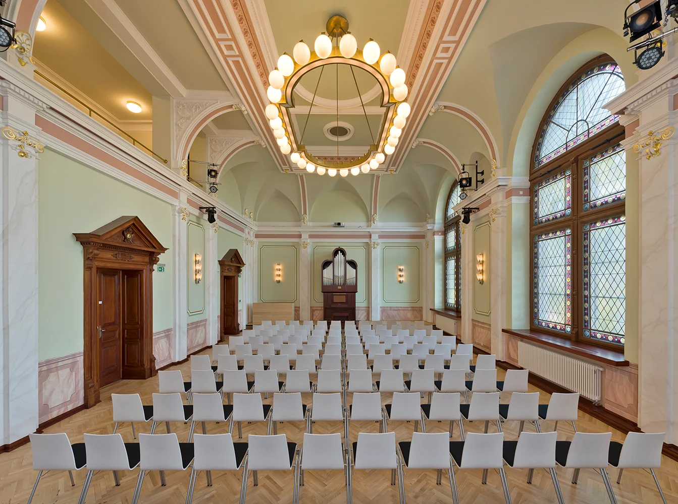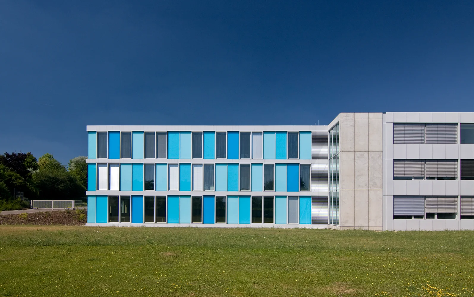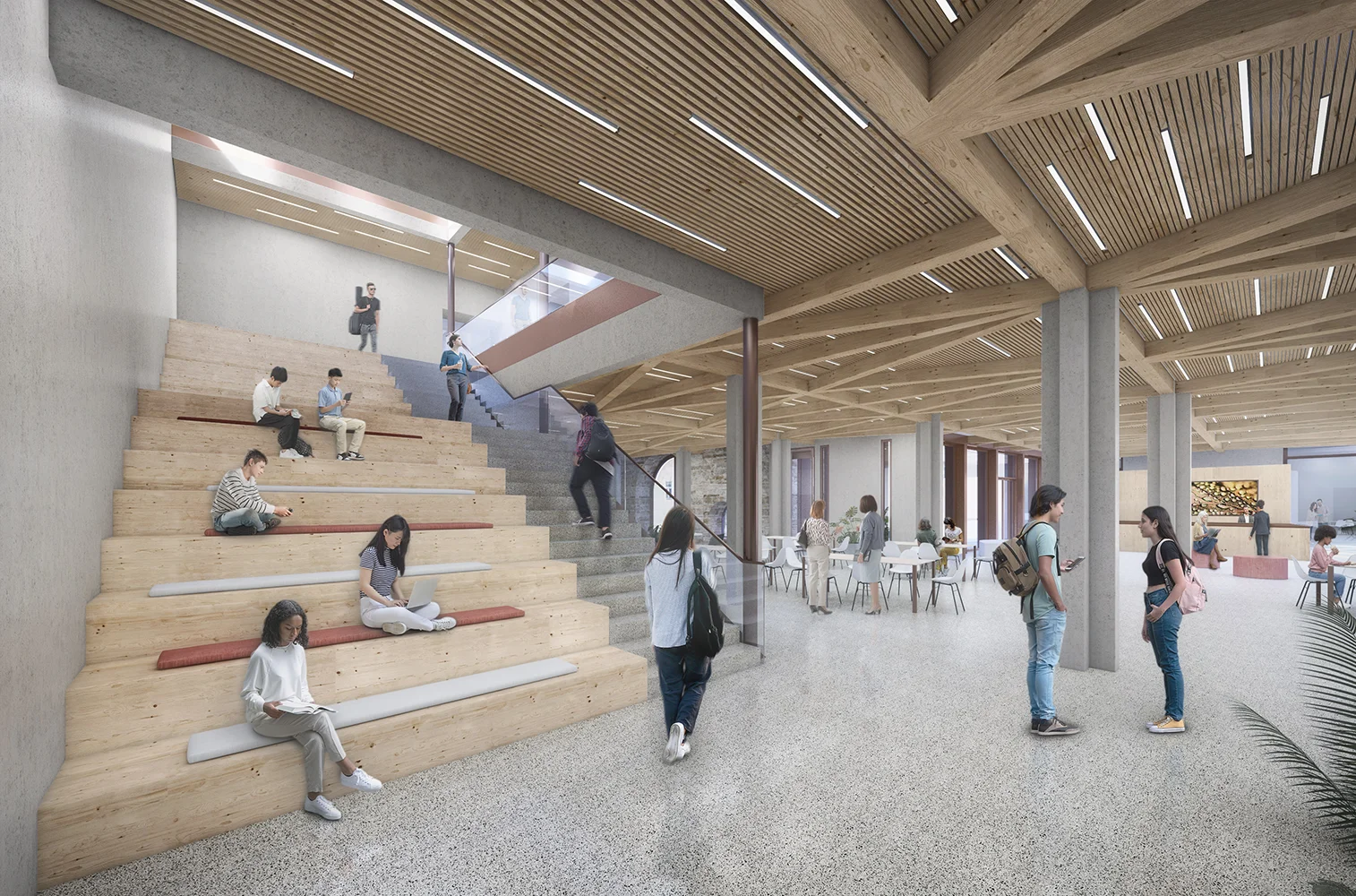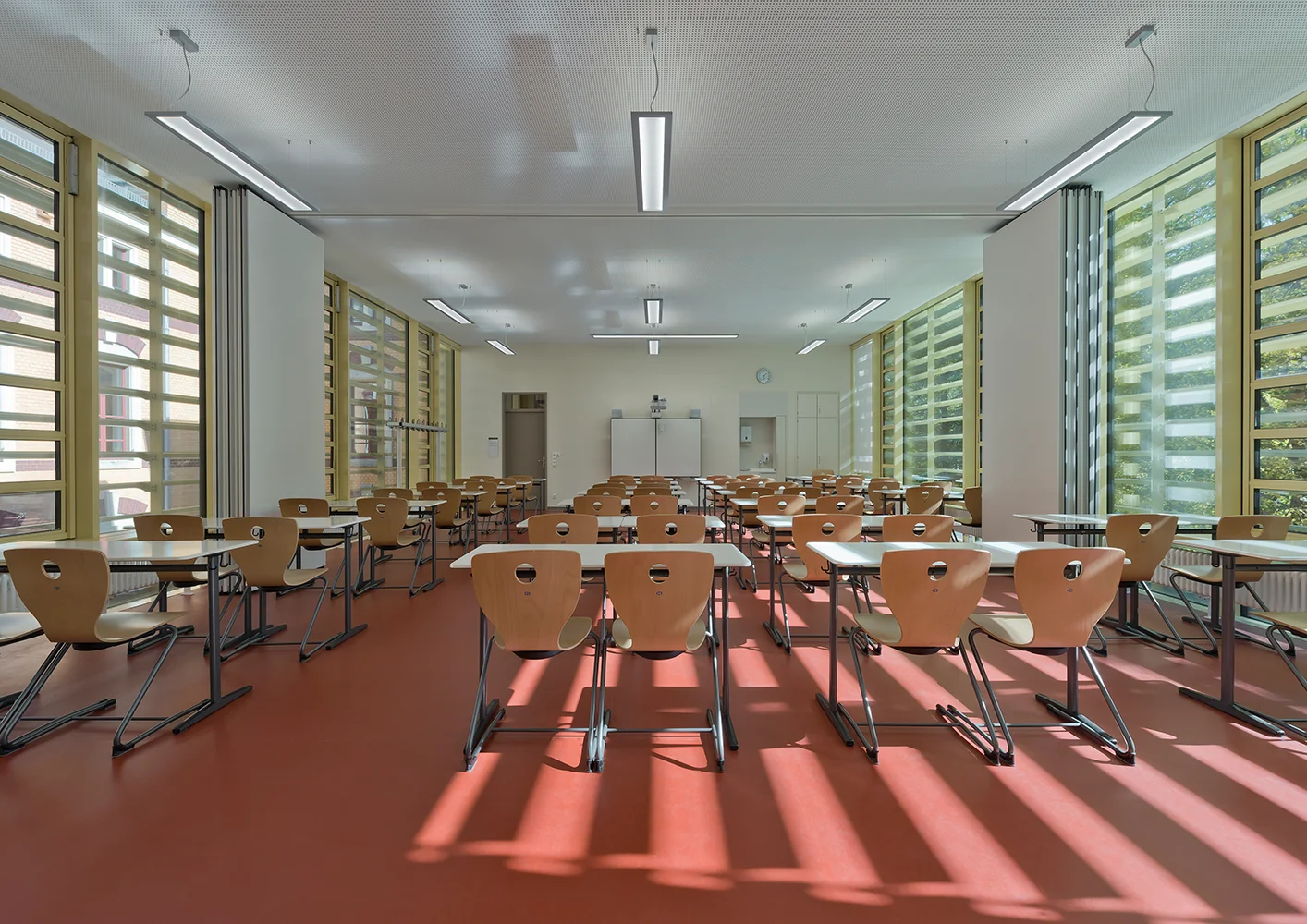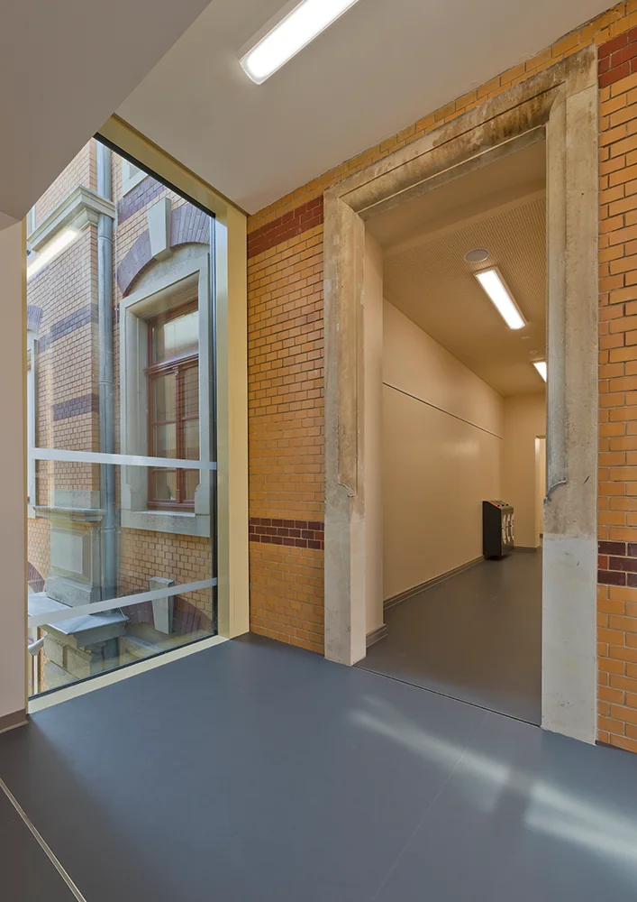 Die Erweiterungsbauten wurden bewusst in die Zwischenräume der Seitenflügel eingefügt, um die Symmetrie zu bewahren und den historischen Schulpark zu schützen. Es entstanden zwei neue Höfe, die in die Nutzung der angrenzenden Mensa und Bibliothek einbezogen werden können und attraktive Aufenthaltsbereiche schaffen. Innen verbinden zurückhaltende Farben, neue Selbstlerninseln und offene Begegnungszonen Altes und Neues. Die Sanierung umfasste Barrierefreiheit, neue Haustechnik, energetische Optimierung – und viel Liebe zum Detail.