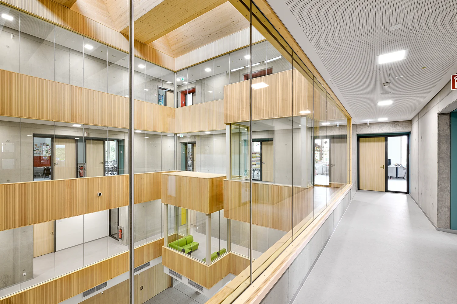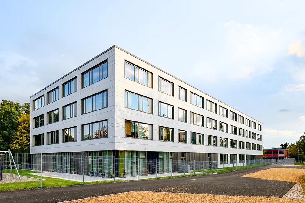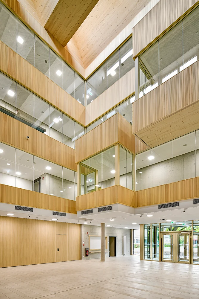 Am Thoner Espan in Nürnberg entstand ein moderner Schulcampus mit klarer architektonischer Haltung und nachhaltiger Bauweise – entwickelt als zukunftsfähige Lösung für Ganztagsangebote, flexible Raumorganisation und gemeinsame Nutzung.