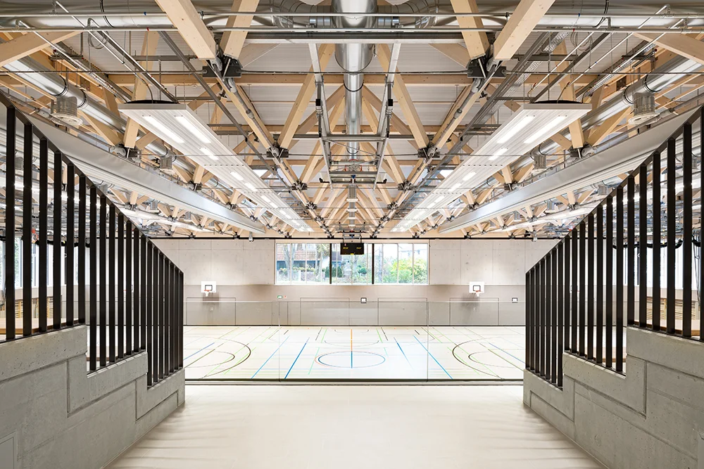 Die abgesenkte Dreifeldsporthalle mit Tribüne wurde im zweiten Bauabschnitt errichtet und bewusst in den Campus integriert – funktional, barrierefrei und städtebaulich eingebettet. Eine robuste Bauweise, extensive Dachbegrünung, Photovoltaik und eine Fassade aus Faserzementplatten unterstreichen den nachhaltigen Anspruch.
